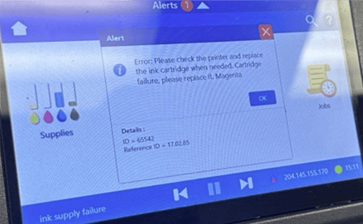 Error: Please check the printer and replace the ink cartridge when needed. Details: ID=65542/ Ref ID=17.0x.85.