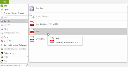 How do I save LAS Files as TIFF or PDFs in NeuraView?