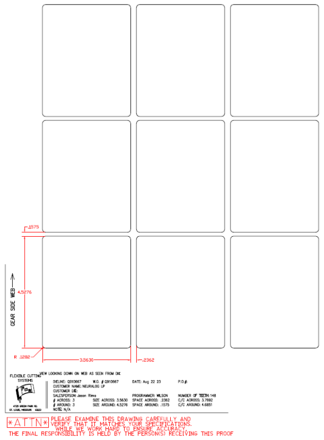 Below is an example of the information that will be required by your die maker when ordering a die. The example is of a 3 high by 3 across 3.5630” x 4.5276” rectangle, 0.1282” corner radius, 0.2362” gap, 3mm distance between cuts and top and bottom edges. Supplying a sample of the material to be used with your order is advisable if you do not have specifics on the label material.