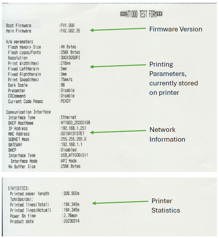 Printer will print the NT1000 status report as shown. Sections that are not applicable have been removed for brevity.
