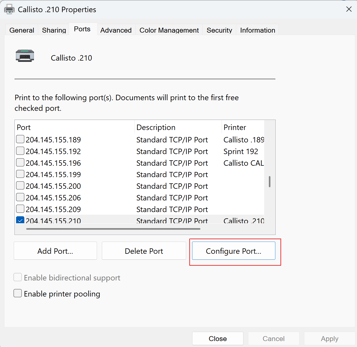 - Select the Configure Port... button for the selected TCP/IP port network address.