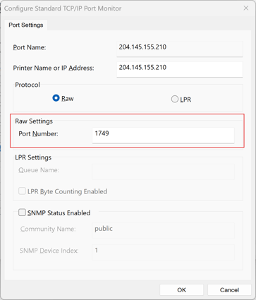 NOTE: Most printers use port 9100 by default; Callisto uses 1749.
